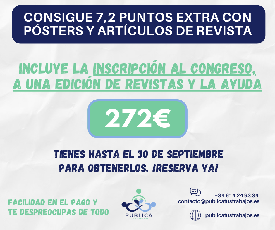 Si no quieres que te ayudemos no pasa nada, el precio sería de 109 euros de la editorial aplicando el cupón descuento PUBLICATUSTRABAJOS (este cupón se lo puedes pasar a quien quieras) y para los congresos sería el mismo cupón y se te aplicaría 10 euros de descuento respecto al precio del mismo. Nosotros te buscaremos grupo, aunque tendrías que realizar tú todo lo demás.